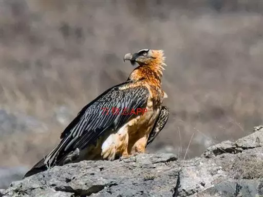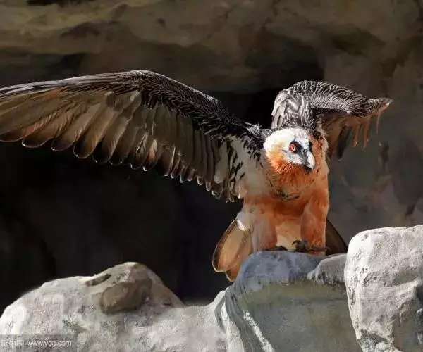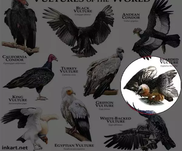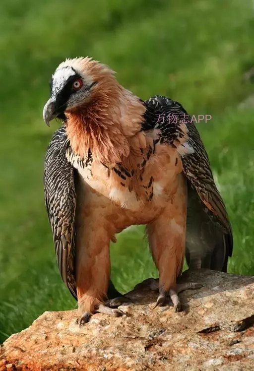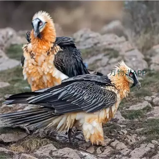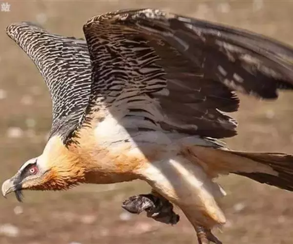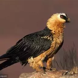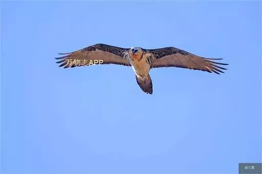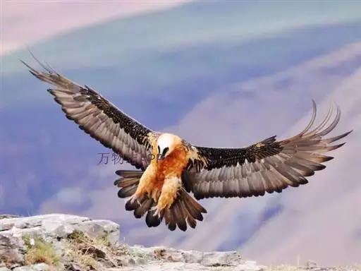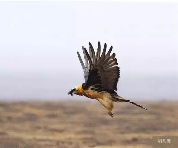 胡兀鹫(学名:Gypaetus barbatus):也名胡秃鹫,体重3.5-5.6千克;体长1-1.4米。全身羽色大致为黑褐色。它的名字因吊在嘴下的黑色胡须而得。头灰白色,有黑色贯眼纹,向前延伸与颏部的须状羽相连。后头、颈、胸和上腹红褐色,后头和前胸上有黑色斑点。体型一般是雌鸟比雄鸟稍大。