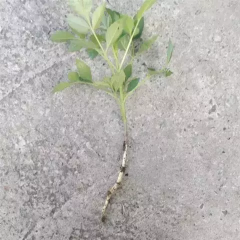 根圆柱形,弯曲,主根不明显,支根多条丛生于根茎,长约15cm,直径0.2-0.5cm。表面灰褐色或浅棕褐色,有细皱纹,外皮剥落处显出橙黄色木部。质稍硬。断面类白色或灰黄色,用扩大镜观察可见多数小孔,并有同心排列橙黄色环纹。气微,味淡。