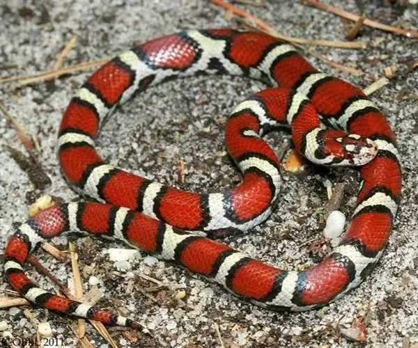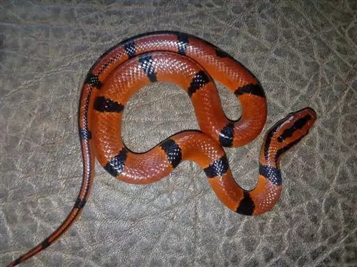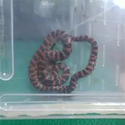 牛奶蛇,这是所有陆栖蛇类分布最广的种类之一,从加拿大东南部到哥伦比亚及厄瓜多尔都可见其踪迹。成体有100-180cm,是一种无毒有益的王蛇,原产于北美洲、中美洲,常见于美国,加拿大,墨西哥,厄瓜多尔等国家。喜欢躲藏在安全私隐的地方,如洞穴类,喜爱中至低的湿度。属卵生动物,交配期为春季至夏季,孵化期是秋季,换孕期一般为28-30天。每次一般产下10个蛋左右。