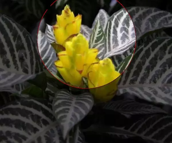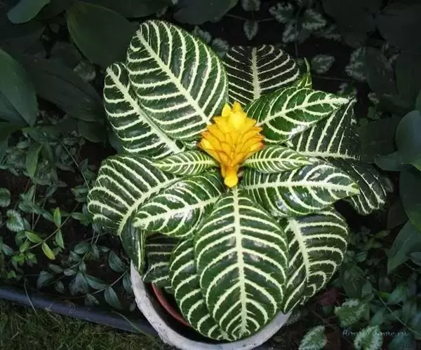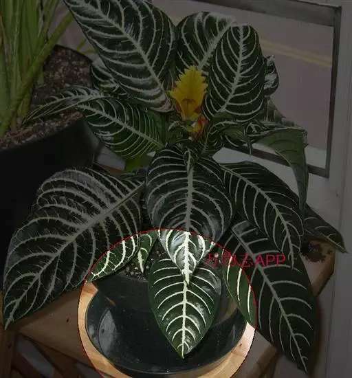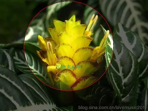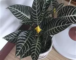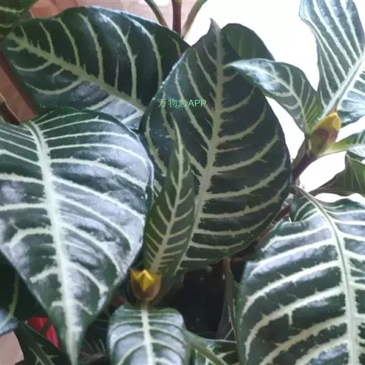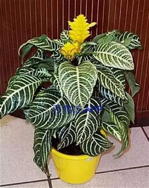 银脉爵床,又名斑马花、斑马爵床,爵床科单药花属多年生常绿草本植物。茎直立、方形、植株粗壮。略带肉质。叶对生。卵形或椭圆状卵形,叶子长约15cm~20cm。宽约10cm;叶端尖,叶片深绿色有光泽,叶面具有明显的白色条纹状叶脉,叶脉、叶缘均有波状起伏。因叶片上的斑纹酷似斑马身上的花纹。穗状花序顶生或腋生,花簇金字塔形,苞片金黄色,十分醒目。有时具红色边缘。交互对列包裹着花梗,如同屋顶瓦片样层层重叠。花双唇形,淡黄色,5个萼片。花期夏秋季,但在适宜的条件下全年都可开放。