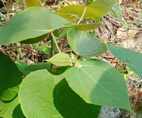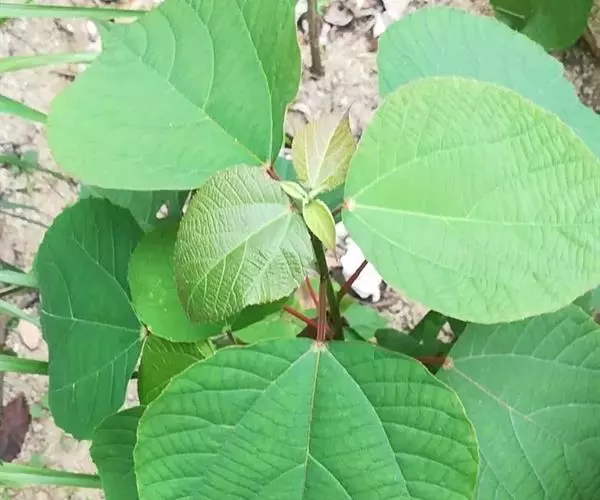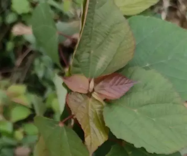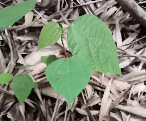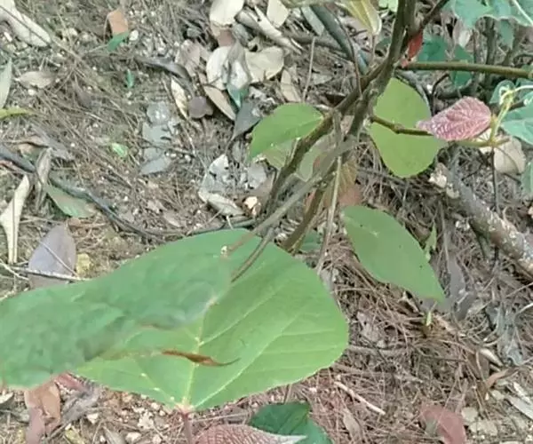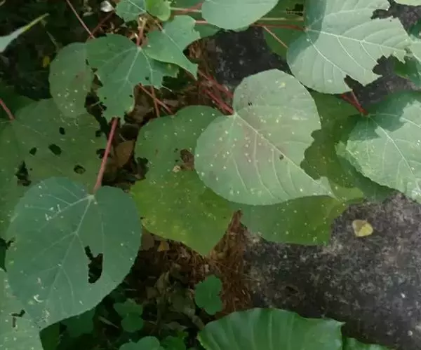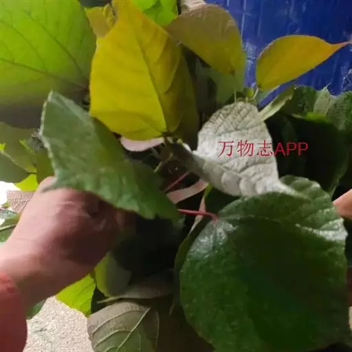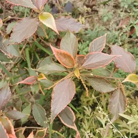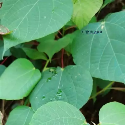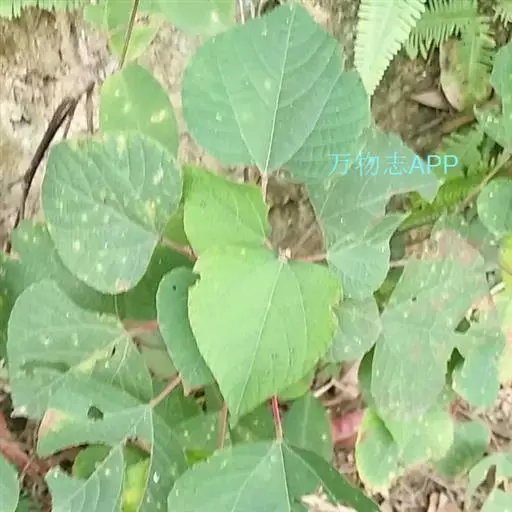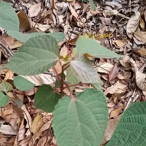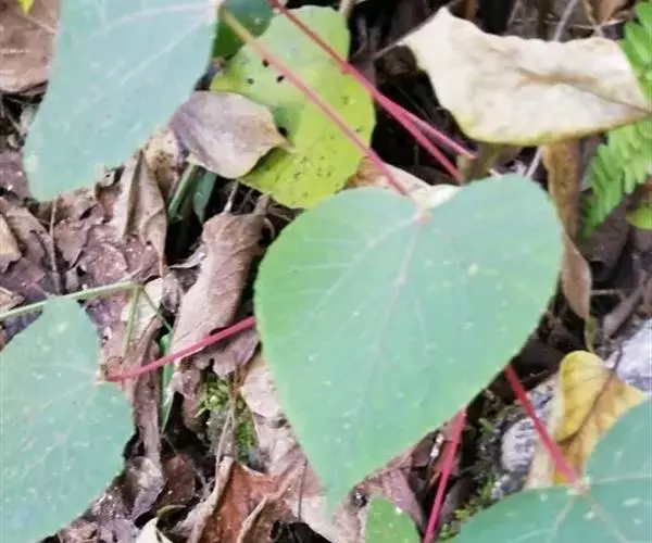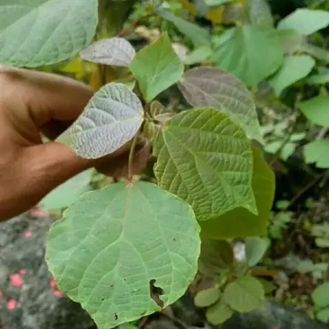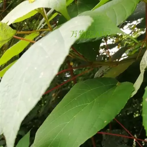 灌木,高1-2米;小枝被灰色微柔毛,后变无毛。叶薄纸质,阔卵形,长8-15厘米,宽7-13厘米,顶端急尖或渐尖,基部浅心形或近截平,边缘疏生具腺小齿,上面无毛,下面浅红色,仅沿脉被微柔毛,基部具斑状腺体4个;基出脉3条;小托叶披针形,长2-3.5毫米;叶柄长7-12厘米;托叶钻状,长3-5毫米,具毛,凋落。雌雄异株,雄花序穗状,腋生或生于一年生小枝已落叶腋部,长7-15厘米,具微柔毛,苞片三角形,长约1毫米,雄花(3-5) 11-15朵簇生于苞腋;花梗长约2毫米,无毛,中部具关节;雌花序总状,顶生,长5-6厘米,具花5-12朵,各部均被微柔毛,苞片狭三角形,长约4毫米,基部具腺体2个,小苞片披针形,长约3毫米;花梗长1毫米;雄花:花萼花蕾时球形,无毛,直径1.5毫米,萼片4枚,长圆形;雄蕊(7-)8枚;雌花:萼片5 (-6)枚,披针形,长3-4毫米,被短柔毛,其中1枚的基部具1个腺体;子房球形,被短绒毛,花柱3枚,线状,长12-15毫米,合生部分长不及1毫米。蒴果球形,具3圆棱,直径8-10毫米,果皮平坦,被微柔毛;种子扁卵状,长6毫米,种皮浅褐色,具瘤体。花期3-5月,果期6-8月。
