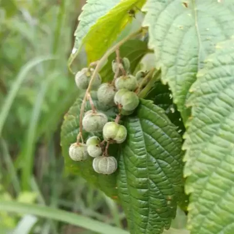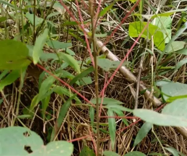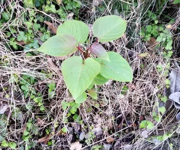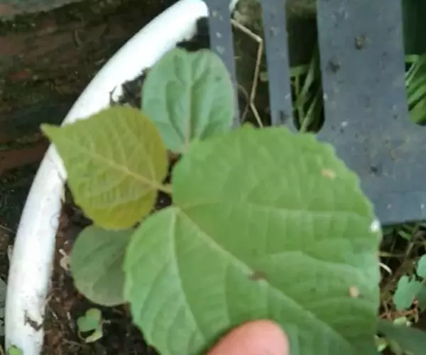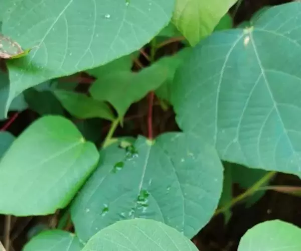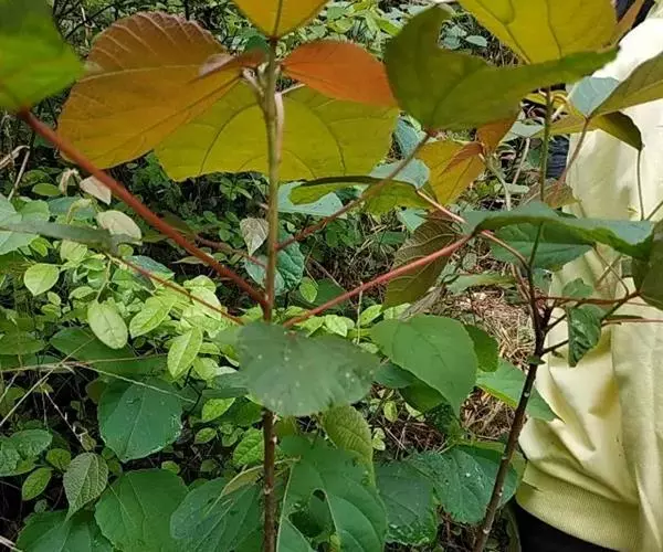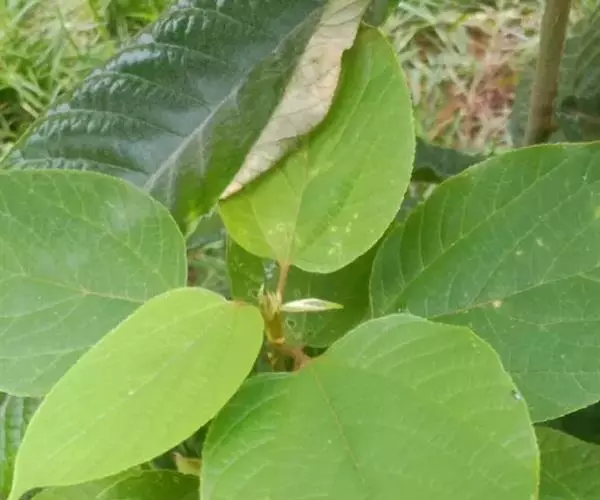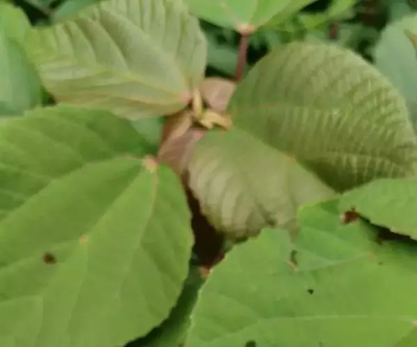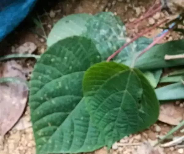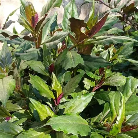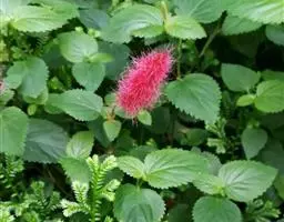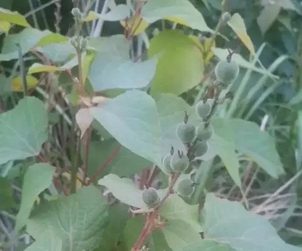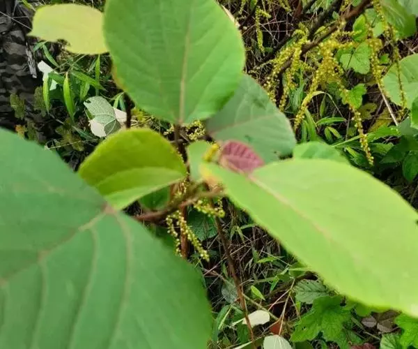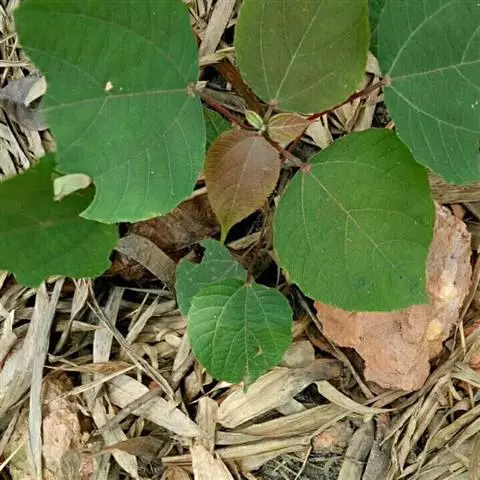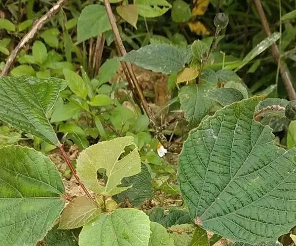 灌木,高1-2米;小枝被灰色微柔毛,后变无毛。叶薄纸质,阔卵形,长8-15厘米,宽7-13厘米,顶端急尖或渐尖,基部浅心形或近截平,边缘疏生具腺小齿,上面无毛,下面浅红色,仅沿脉被微柔毛,基部具斑状腺体4个;基出脉3条;小托叶披针形,长2-3.5毫米;叶柄长7-12厘米;托叶钻状,长3-5毫米,具毛,凋落。雌雄异株,雄花序穗状,腋生或生于一年生小枝已落叶腋部,长7-15厘米,具微柔毛,苞片三角形,长约1毫米,雄花(3-5) 11-15朵簇生于苞腋;花梗长约2毫米,无毛,中部具关节;雌花序总状,顶生,长5-6厘米,具花5-12朵,各部均被微柔毛,苞片狭三角形,长约4毫米,基部具腺体2个,小苞片披针形,长约3毫米;花梗长1毫米;雄花:花萼花蕾时球形,无毛,直径1.5毫米,萼片4枚,长圆形;雄蕊(7-)8枚;雌花:萼片5 (-6)枚,披针形,长3-4毫米,被短柔毛,其中1枚的基部具1个腺体;子房球形,被短绒毛,花柱3枚,线状,长12-15毫米,合生部分长不及1毫米。蒴果球形,具3圆棱,直径8-10毫米,果皮平坦,被微柔毛;种子扁卵状,长6毫米,种皮浅褐色,具瘤体。花期3-5月,果期6-8月。