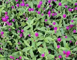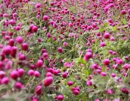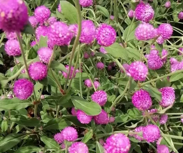千日红 千日红花期长,花色鲜艳,为优良的园林观赏花卉。是花坛、花境的常用材料,且花后不落,色泽不褪,仍保持鲜艳。