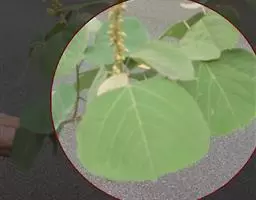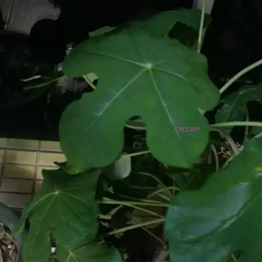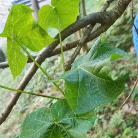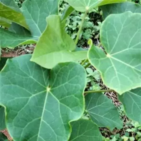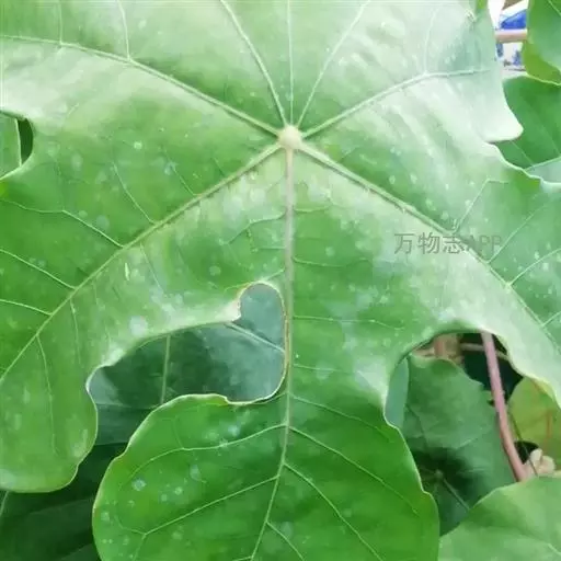叶盾状着生,轮廓近圆形至阔椭圆形,长8-18厘米,宽6-16厘米,顶端圆钝,基部截形或钝圆,全缘或2-6浅裂,上面亮绿色,下面灰绿色,两面无毛;掌状脉6-8,其中上部3条直达叶缘;叶柄长8-16厘米,无毛;托叶分裂呈刺状,宿存。