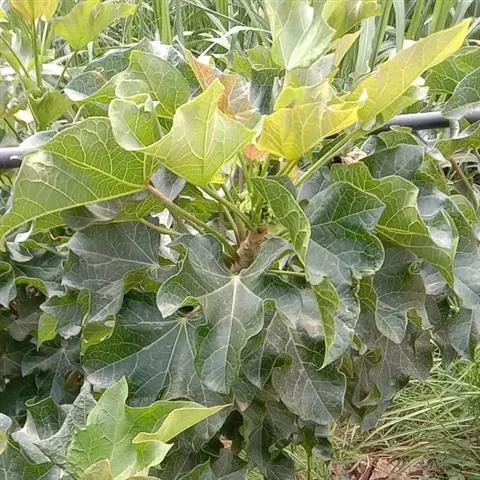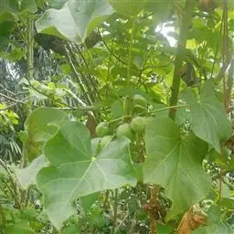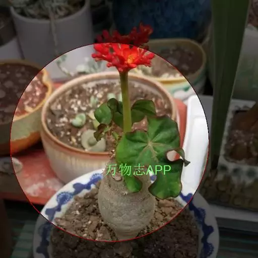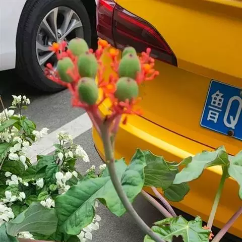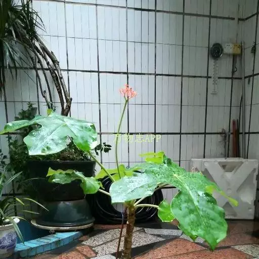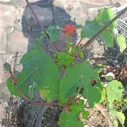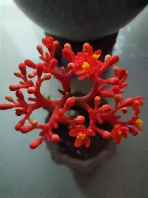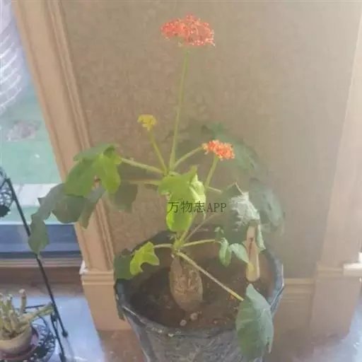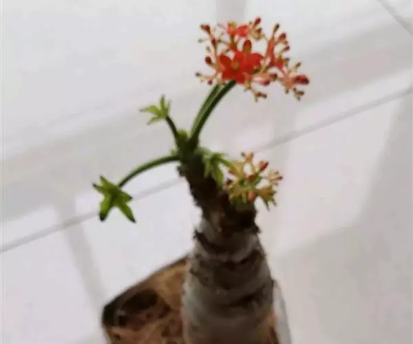 佛肚树(学名:Jatropha podagrica Hook.)是大戟科麻疯树属的肉质灌木,茎基部膨大呈卵圆状棒形,茎端两歧分叉。茎表皮灰色易脱落。叶簇生分枝顶端,绿色,光滑又稍具蜡质白粉。托叶角质分叉,刺状,宿存于茎枝上很长时间。花序长15厘米,重复两歧分叉,花鲜红色。