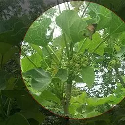 ⑸依上述步骤在膏桐的各枝上进行嫁接,这样膨大球茎就移到膏桐树上成为一棵新的植株共同生长。
