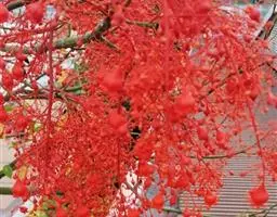 花序顶生,具长总梗,分枝短,红色,花萼长约2毫米,裂片近圆形,长约1毫米;花瓣倒卵状长圆形,长约6毫米,红色;雄花:雄蕊6-8枚,基部合生,花药与花丝近等长;雌花:子房无毛,花柱3枚,基部合生,顶端2裂。蒴果椭圆状,长13-18毫米,直径约15毫米,具3纵沟;种子长约1.1厘米,平滑。花期几全年。