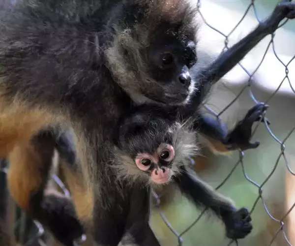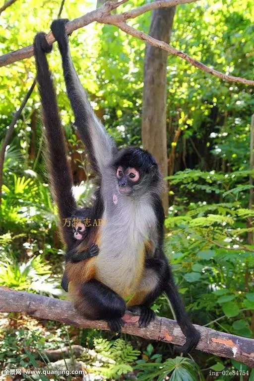 蜘蛛猴是猿猴类中最有趣的一种动物。有一根卷曲的尾巴,这根尾巴既有平衡身体的作用,又有抓曳食物、悬吊躯体的功能。其中又以蜘蛛猴的尾巴最为奇妙。蜘蛛猴动作特别敏捷,已知的蛛蜘猴有7种。蜘蛛猴瘦高个子,但有点大腹便便。头体长约35-66厘米。四肢细长,手没有拇指。毛茸茸的尾巴约有60-92厘米长,很会抓住树枝,其功能有点像手。几种蜘蛛猴的毛发颜色不一,有灰色、红色、深褐色和黑色几种。长短和浓密的程度也不一样。