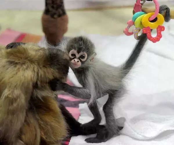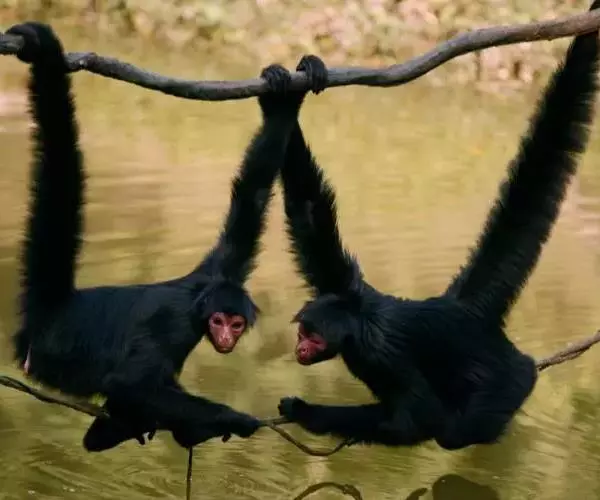 蛛猴属(学名:Ateles):共有7种。头体长约35-66厘米。头又圆又小,四肢细长,手没有拇指。毛茸茸的尾巴约有60-92厘米长,很会抓住树枝,其功能有点像手。尾巴比身体还长,缠绕性极强。能直立行走。它们在树上活动时用细长的四肢纵跃或爬行,还能用长尾巴缠绕在树枝上荡来荡去。群居生活,群体数量可达35只以上。因相当细长的四肢和尾巴宛如蜘蛛而得名。