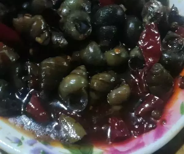 炒田螺 田螺又名香螺,通常生活在池塘、水田、小溪或河沟里。为满足人们需要,这些年来有的地方已发展人工养殖。田螺个体不大,肉不多,其真正的肌肉只是螺口伸出来的头和足,因此在吃田螺时,我们只吃其肉,弃五脏而不吃。