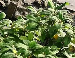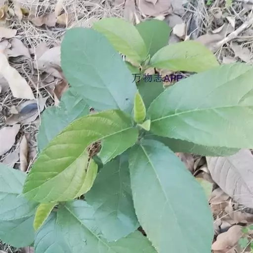 对叶榕(原变种),灌木或小乔木,被糙毛,叶通常对生,厚纸质,卵状长椭圆形或倒卵状矩圆形,长10-25厘米,宽5-10 厘米,全缘或有钝齿,顶端急尖或短尖,基部圆形或近楔形,表面粗糙,被短粗毛,背面被灰色粗糙毛,侧脉6-9对;叶柄长1-4厘米,被短粗毛;托叶2,卵状披针形,生无叶的果枝上,常4枚交互对生,榕果腋生或生于落叶枝上,或老茎发出的下垂枝上,陀螺形,成熟黄色,直径1.5-2.5厘米,散生侧生苞片和粗毛,雄花生于其内壁口部,多数,花被片3,薄膜状,雄蕊1;瘿花无花被,花柱近顶生,粗短;雌花无花被,柱头侧生,被毛。花果期6-7月。