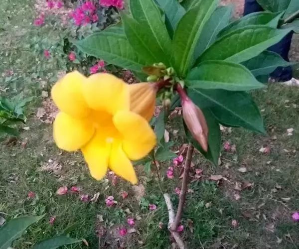 正名为(黄蝉Allemanda neriifolia Hook.)直立灌木,观赏价值高。
