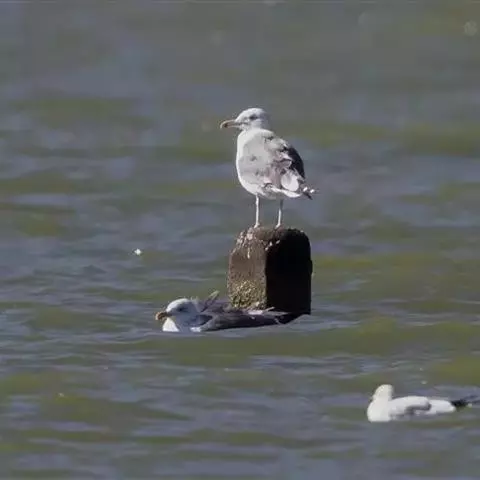 灰背鸥大型水鸟,体长62~69厘米。嘴直,黄色,下嘴先端有红色斑。脚粉红色,头、颈和下体白色,背、…