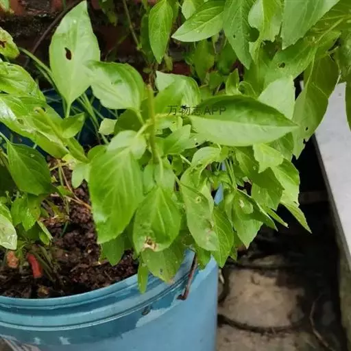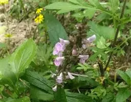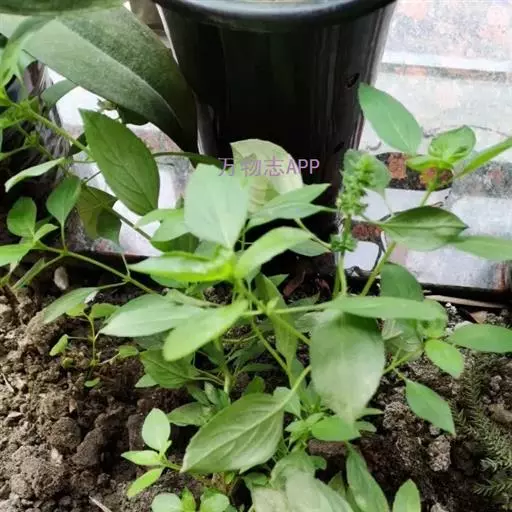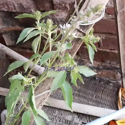 圣罗勒(O.cimum sanctum),基部木质化,花白色或粉红色,叶片上有毛,叶缘有齿,具香辣味。