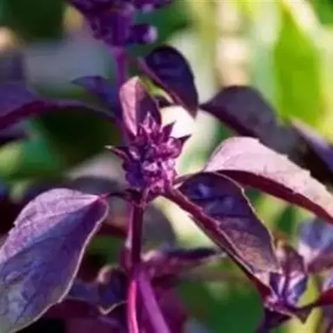 紫罗勒(Purple Ruffles),茎叶暗紫红色,叶子沿中脉上折,叶片卷曲有褶皱。一般用来泡酒制滋补品,具有壮阳作用。