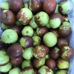 七月鲜 果实卵圆形,果面平整,平均果重29.8克,最大74.1克。果个均匀,果皮薄,深红色,表面蜡质较少。可溶性固形物含量28.9%,可食率98.8%。鲜枣味甜,肉质细,极宜鲜食,8月下旬红熟,比梨枣早上市20-30天,克服了梨枣采前落果严重,未红先蔫的缺点。该品种抗旱性强,丰产稳产,是极为可贵的极早熟优良鲜食品种。