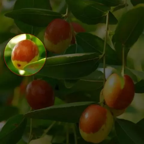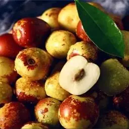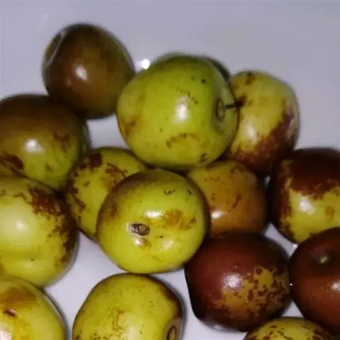 枣(学名:Ziziphus jujuba Mill.),别称枣子,大枣、刺枣,贯枣。鼠李科枣属植物,落叶小乔木,稀灌木,高达10余米,树皮褐色或灰褐色,叶柄长1-6毫米,或在长枝上的可达1厘米,无毛或有疏微毛,托叶刺纤细,后期常脱落。花黄绿色,两性,无毛,具短总花梗,单生或密集成腋生聚伞花序。核果矩圆形或是长卵圆形,长2-3.5厘米,直径1.5-2厘米,成熟后由红色变红紫色,中果皮肉质、厚、味甜。种子扁椭圆形,长约1厘米,宽8毫米。