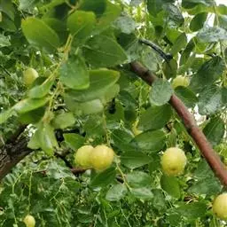 晋枣 树势高,高大直立,枝粗硬,产量高,果实圆筒形或长卵形,果顶一端略细,平均单果重34克,最大可达60-70克。果个均匀,果皮薄,红棕色,有光泽。鲜枣肉质脆嫩,致密多汁,味甘美,含糖28%,含酸0.21%,品质上等,干制等35%,9月下旬成熟。