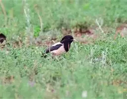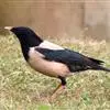 粉红椋鸟是雀形目椋鸟科粉红椋鸟属鸟类。头顶具紫色羽冠;头部、颈、颏、喉黑色具蓝紫色金属光泽;背和腹粉红色;两翅和尾黑褐色;虹膜暗褐色;嘴黄色或粉红色,上嘴基部黑色,冬季嘴为褐色;脚黄色。嘴较其他椋鸟短而钝,上嘴弯曲较明显;脚较粗壮,爪发达。粉红椋鸟分布于欧洲东南部、西伯利亚、西亚、印度和斯里兰卡岛等地区,在中国新疆西部和北部、西藏西部、澳门、台湾等地也能看到其身影。栖息于干旱平原、荒漠或半荒漠地区。常成群活动,鸣声嘈杂。主要在地面觅食,以甲虫、蝗虫、毛虫等各种昆虫为食,偶食植物果实和种子。繁殖期5—7月,营巢于岩壁缝隙、树洞中,每窝产卵4—6枚,卵白色或淡蓝色,孵化期13—15天。雏鸟晚成性,由雌雄亲鸟共同喂养。粉红椋鸟种群数量较少,已被列入中国国家林业局2000年8月1日发布的《国家保护的有益的或者有重要经济、科学研究价值的陆生野生动物名录》。