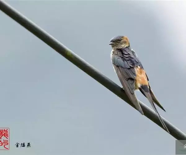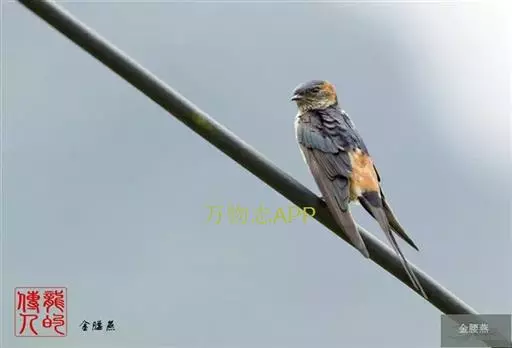 金腰燕(学名:Cecropis daurica):体长16-18厘米,体重18-21克,寿命15年。上体黑色,具有辉蓝色光泽,腰部栗色,脸颊部棕色,下体棕白色,而多具有黑色的细纵纹,尾甚长,为深凹形。最显著的标志是有一条栗黄色的腰带,浅栗色的腰与深蓝色的上体成对比,下体白而多具黑色细纹,尾长而叉深。 虹膜褐色;嘴及脚黑色。喙短而宽扁,基部宽大,呈倒三角形,上喙近先端有一缺刻;口裂极深,嘴须不发达。翅狭长而尖,尾呈叉状,形成“燕尾”,脚短而细弱,趾三前一后。