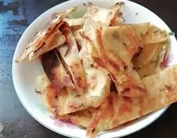 6.平底锅放入少量油,烧热,将饼放入,转中火,边烙边用铲子旋转,烙成两面金黄,切成小块装盘即可。