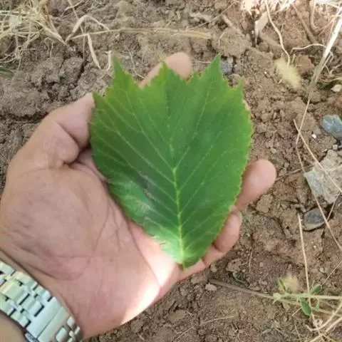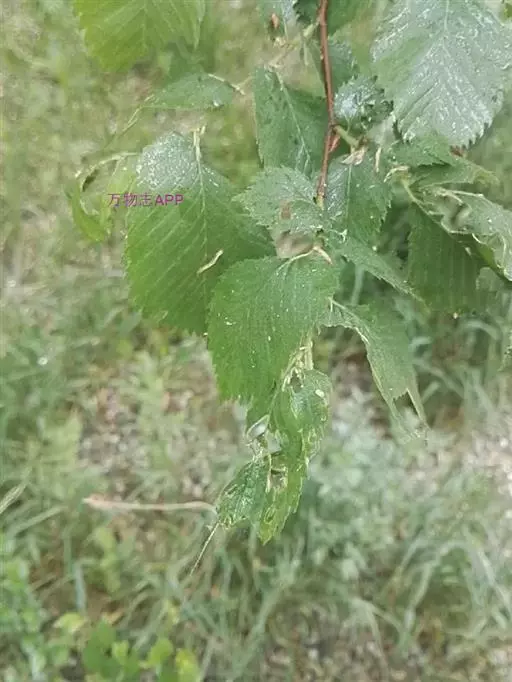 叶倒卵状宽椭圆形或椭圆形,通常长8-15厘米,中上部较宽,先端凸尖,基部明显地偏斜,一边楔形,一边半心脏形,边缘具重锯齿,齿端内曲,叶面无毛或叶脉凹陷处有疏毛,叶背有毛或近基部的主脉及侧脉上有疏毛,叶柄长6-13毫米,全被毛或仅上面有毛。