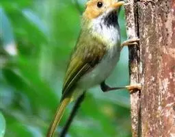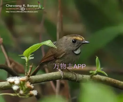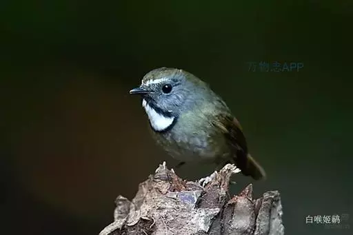 白喉姬鹟(学名:Anthipes monileger):体长11-13厘米,是一种体型小的橄榄褐色鹟。特征为颏及喉白色且成胸兜,缘以黑色的髭纹及项纹。上体红褐色,前额和一相连的短的眉纹白色,眼先、耳覆羽和头侧灰褐色而杂白色,颏、喉白色,形成一大的三角白斑,周边衬的黑缘,甚为醒目。胸及两胁沾皮黄。指名亚种眉纹皮黄。其余下体橄榄褐色,腹中央白色。翼及尾偏红。虹膜褐色,嘴黑色,脚近灰色。