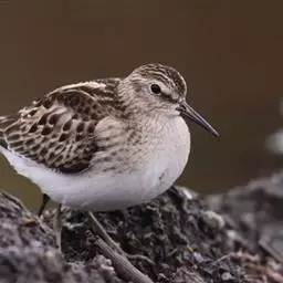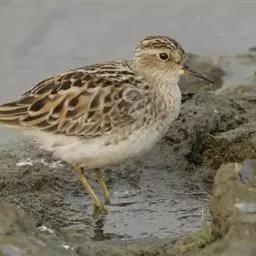 青脚滨鹬(学名:Calidris temminckii)是丘鹬科滨鹬属鸟类。小型涉禽,体长12-17厘米。外形大小和长趾滨鹬相似。嘴黑色,脚黄绿色。夏羽上体灰黄褐色,头顶至后颈有黑褐色纵纹。背和肩羽有黑褐色中心斑和栗红色羽缘及淡灰色尖端。眉纹白色,颊至胸黄褐色具黑褐色纵纹,其余下体白色,外侧尾羽纯白色。冬羽上体淡灰褐色具黑色羽轴纹。胸淡灰色,其余下体白色。飞翔时翼上有明显的白带,受惊时能垂直起飞升空。