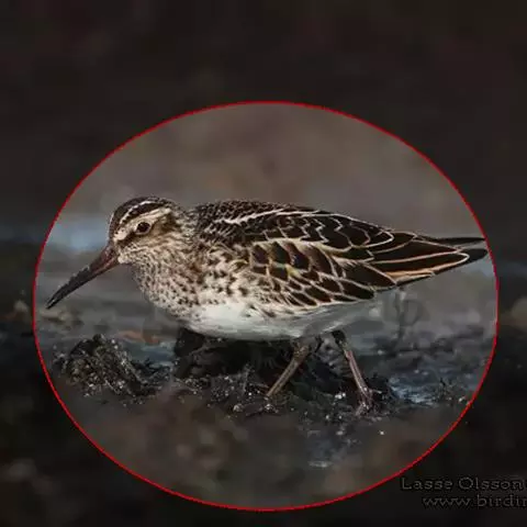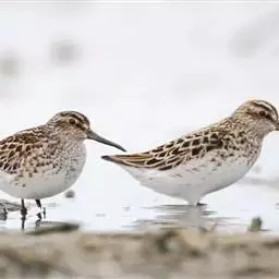阔嘴鹬是涉禽,体长17厘米。特征为翼角常具明显的黑色块斑并具双眉纹。与黑腹滨鹬平滑下弯的嘴相比,…