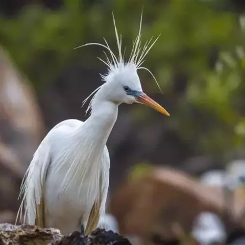 描述:中等体型(60厘米)的白色鹭。与牛背鹭的区别在体型较大而纤瘦,嘴及腿黑色,趾黄色,繁殖羽纯白,颈背具细长饰羽,背及胸具蓑状羽。