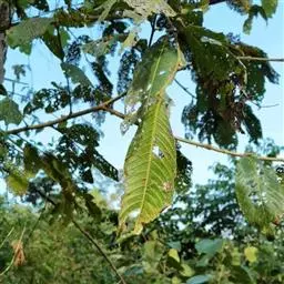 幼林或成林后多出现绒刺蛾、绿黄毛虫和绒毛络瘤蛾等危害,幼虫常群居叶背、取食叶肉,全树甚至大面积危害,严重影响林木的生长,有的由于虫害而导致死亡。防治方法:可选用辛硫鳞50%乳油1000倍液、氰戊菊酯20%乳油3000-4000倍液、功夫(氯氟氰菊酯)2.5%乳油500倍液,每10天喷洒1次,连续2-3次,均能起到较好的防治效果。