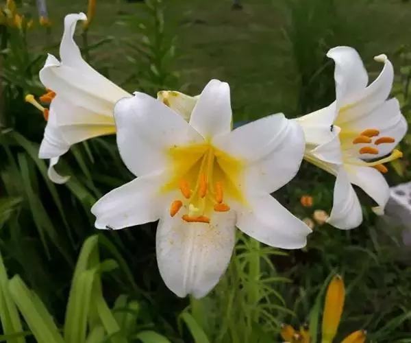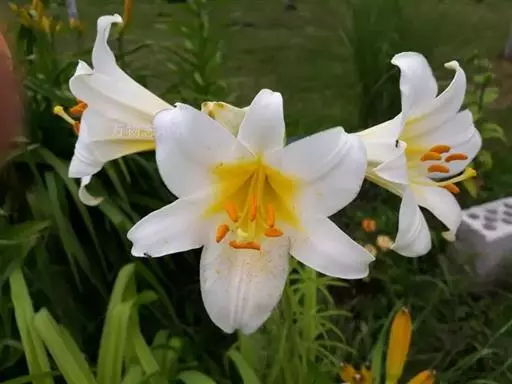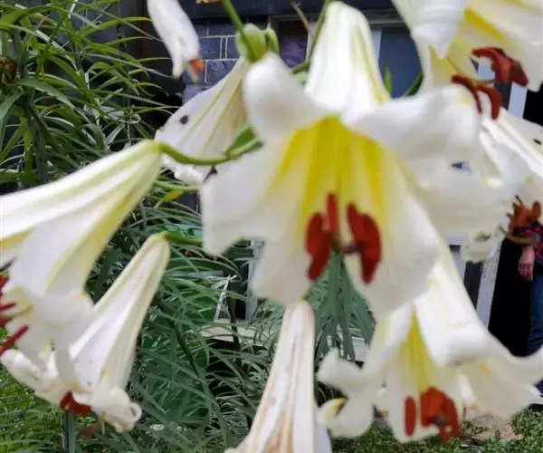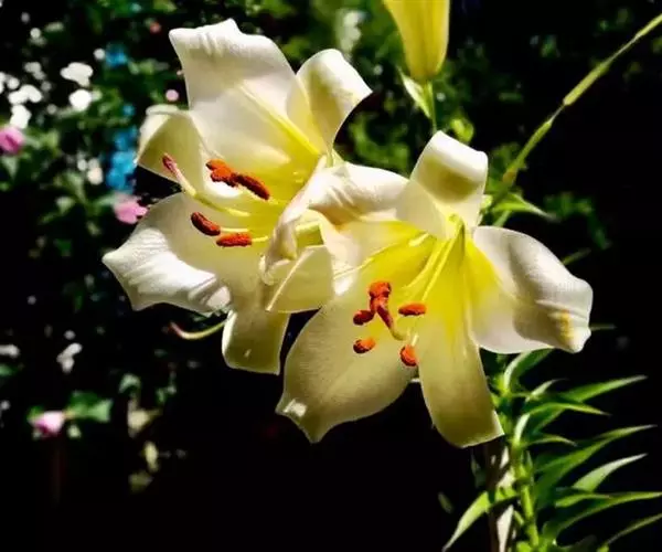 花1至数朵,开放时很香,喇叭形,白色,喉部为黄色;外轮花被片披针形,长9-11厘米,宽1.5-2厘米;内轮花被片倒卵形,先端急尖,下部渐狭,蜜腺两边无乳头状突起;花丝长6-7.5厘米,几无乳头状突起,花药椭圆形,长0.9-1.2厘米,宽约3毫米;子房圆柱形,长约2.2厘米,宽约3毫米;花柱长6厘米,柱头膨大,宽6毫米。花期6-7月。