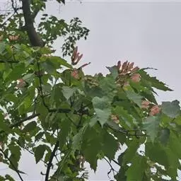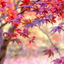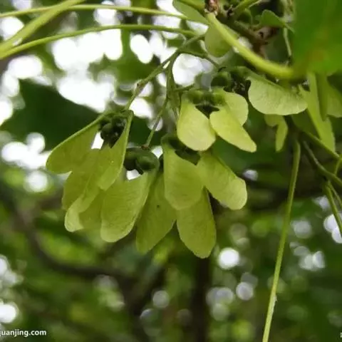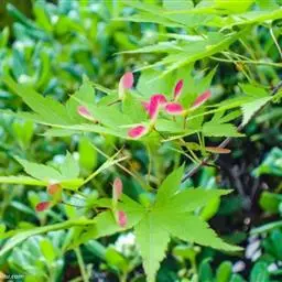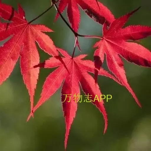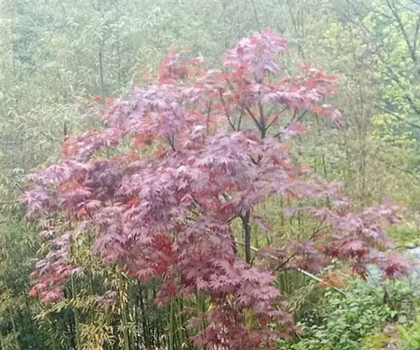 红枫树高2—8米,枝条多细长光滑,偏紫红色。叶掌状,5-7深裂纹,直径5—10CM,裂片卵状披针形,先端尾状尖,缘有重锯齿。花顶生伞房花序,紫色。翅果,翅长2-3CM,两翅间成钝角。