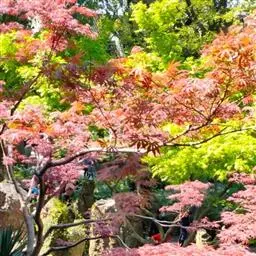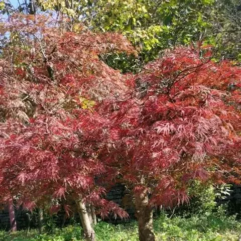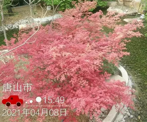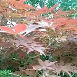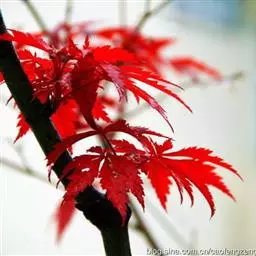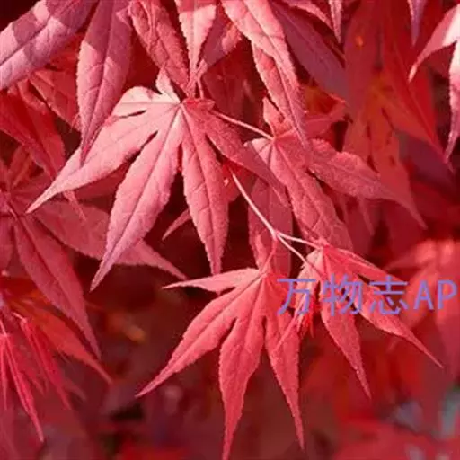 日本红枫又名日本红丝带。被誉为"四季火焰枫"。日本红枫属于槭树科槭树属落叶小乔木或灌木。它的树冠呈扁圆或伞形,掌状5-7深裂,卵状披针形,单叶互生,叶片先端尖锐,叶缘有锯齿。此品种在春、夏、秋三季叶片均为红色,个别品种颜色非常艳丽。夏季随着光照的增强叶体光合作用随之增强,逐渐有变绿的趋势.效果已经不如春季,秋季的时候新叶能够保持红色,但已经发暗,老叶已经变成墨绿色。日本红枫树种较小.一般用做景观绿化用。