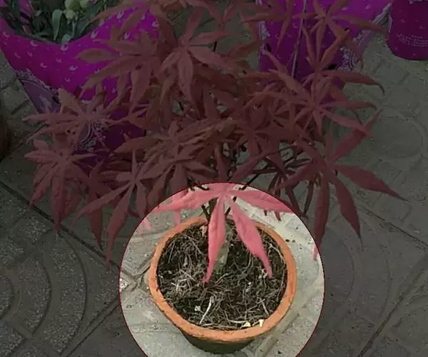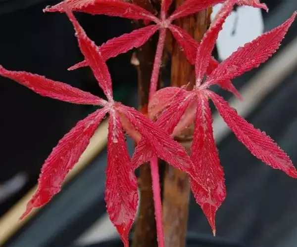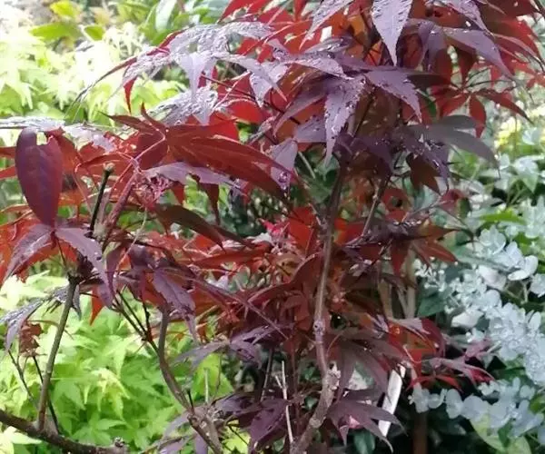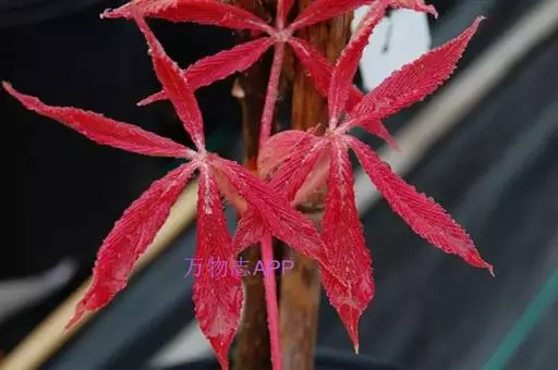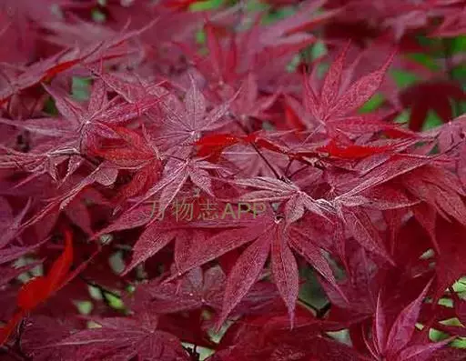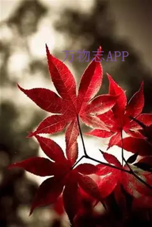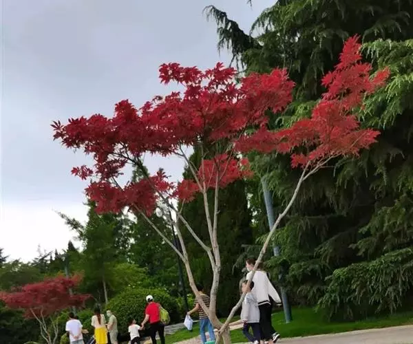 中国红枫又名红叶羽毛枫,为槭树科鸡爪槭的变种,是落叶小乔木,树高达9米。它枝条光滑细长,单叶5—7裂,掌状互生,叶片长椭圆形至披针形,叶缘有重锯齿,幼枝、叶柄、花柄都为红色。花紫色,伞状花序顶生,花期5月。翅果无毛,10月成熟。