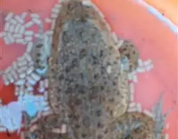 刚发病时,牛蛙的头部皮肤失去光泽, 出现白花纹, 接着表皮层脱落, 露出背肌, 后扩展到躯干, 以至整个背部。重者皮肤腐烂脱落,肌肉裸露,扩展到全身,拒食,不爱活动。