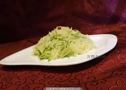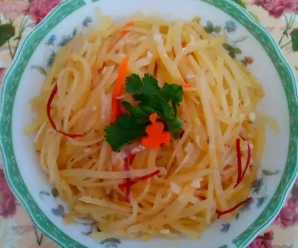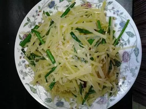 8、土豆丝装盘,上桌前浇上调味汁,拌匀即可。