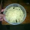 2、将土豆用凉水洗去淀粉(我洗了大概4.5次),胡萝卜丝,土豆丝用开水焯一下,捞出投凉(我大概投了4.5次),控净水;