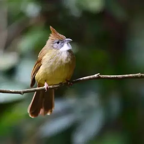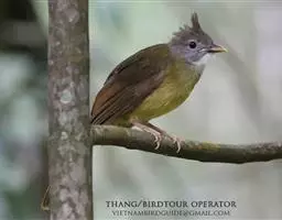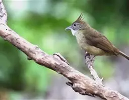 黄腹冠鹎:体长19-24厘米,是一种体型略大的褐色鹎。头顶橄榄褐色具黑褐色羽冠。白色的喉膨起,…