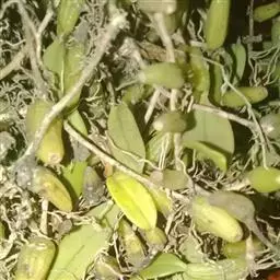 根茎纤细,横生,具节,节上着生假鳞茎,绿色,小形,卵圆状,具棱。每个假鳞茎顶部生叶1片,狭椭圆形或椭圆形,长1.5~3厘米,先端微缺,中脉凹下,全缘。伞形花序由假鳞茎基部抽出,具细总梗,有花4~6朵,花淡黄色 。