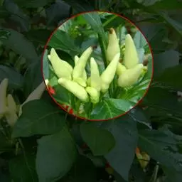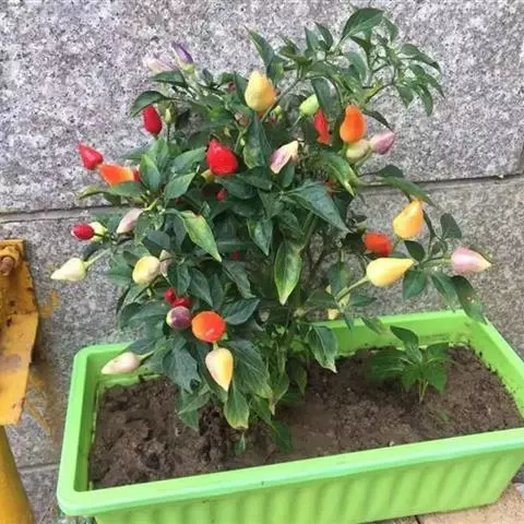 小米粒椒因其果如米粒大小,幼果乳白色而俗称之。株高25厘米左右,分枝多,株型优美,果多,果实呈长扁圆形,果径0.5厘米左右,单果重5克,味辣。其果实在成长过程中有白、紫、红等变化,花白色,叶片深绿色,细小。果实朝上生长,较耐荫,容易管理,观果期长,是家庭用来盆栽观果的最佳辣椒品种之一。因株型小巧,可将盆果置于装饰柜上供观赏。