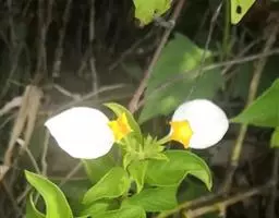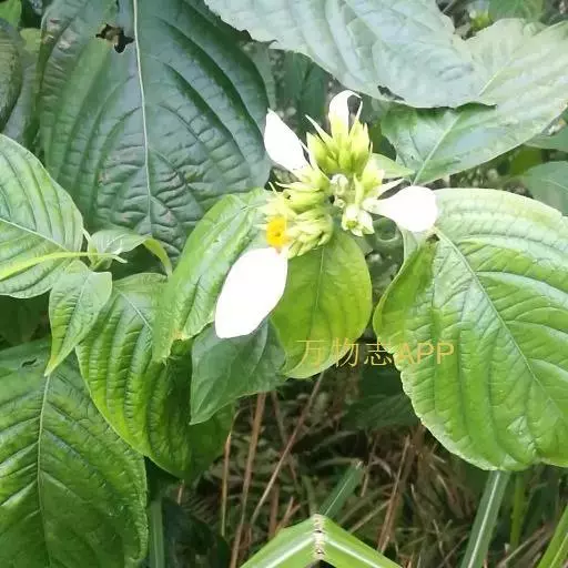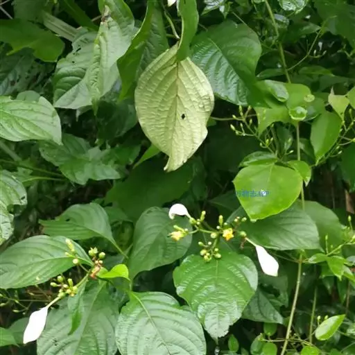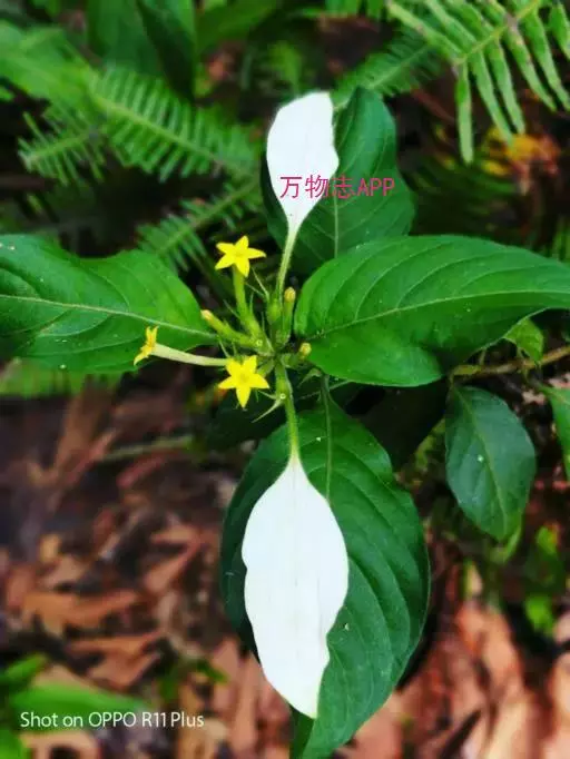 玉叶金花 攀援灌木,嫩枝被贴伏短柔毛。叶对生或轮生,膜质或薄纸质,卵状长圆形或卵状披针形,长5-8cm,宽2-2.5cm,顶端渐尖,基部楔形,上面近无毛或疏被毛,下面密被短柔毛;叶柄长3-8mm,被柔毛;托叶三角形,长4-7mm,深2裂,裂片钻形,长4-6mm。