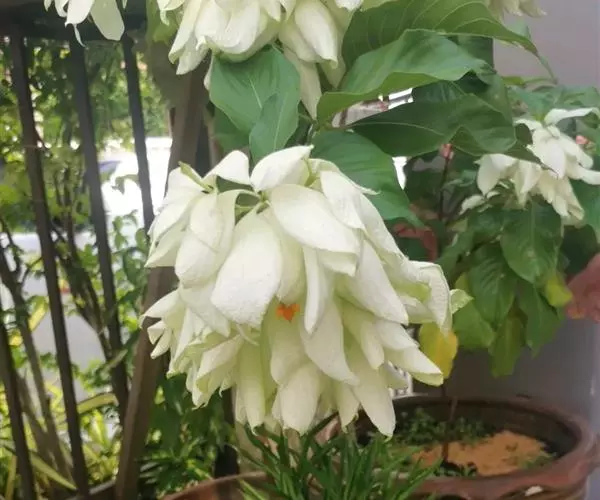 玉叶金花 玉叶金花每年 4 月上旬至 6 月中旬陆续开花不断,8月仍有部分植株开花,花期长达 100 天以上。开花时,叶状雪白的萼片及金黄色的花冠显在树冠上,金花玉叶,绿叶相衬,令人喜爱。其实这些白玉般的叶并不是真正的叶,而是萼片瓣化而来,颜色鲜艳而奇美,是具有开发价值的庭园花卉。其枝条细软,可根据各自爱好,作各式各样的造型盆景,也可在围墙等建筑旁作垂直绿化。