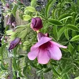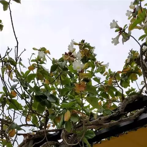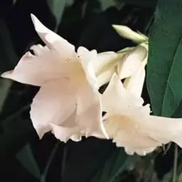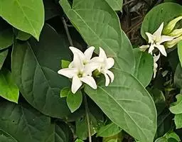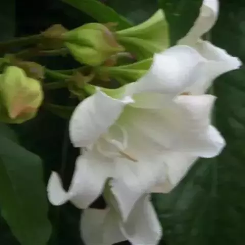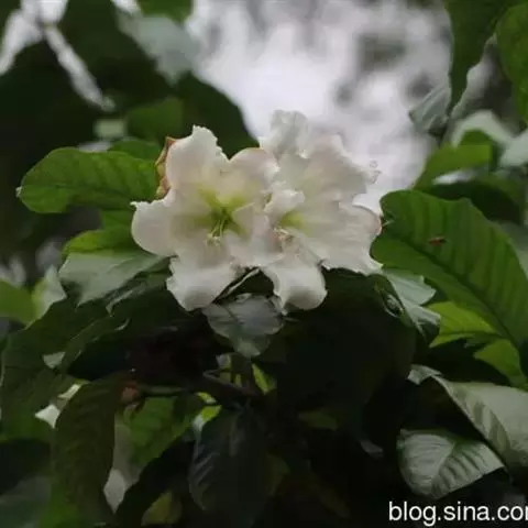 高大木质藤本。全株有乳状液计,枝幼时有锈色柔毛,茎有皮孔。单叶对生;叶柄长达2cm;叶片革质,长圆状倒卵形,长6-15cm,宽3-8cm,先端短渐尖,基部楔形。聚伞花序顶生,着花3-5朵;花梗长2-4cm,花5数;花萼裂片长圆状披针形、倒卵形或倒披针形,长2.5-4cm;花冠长约10cm,漏斗状,裂片卵圆形;雄蕊着生于花冠筒的喉部,花药箭头状。蓇葖果形状多变,圆柱形,长15-18cm,直径3-4cm;内果皮亮黄色。种子长约2cm,种毛白色绢质,长达4cm。花期春、夏季,果期秋、冬季。