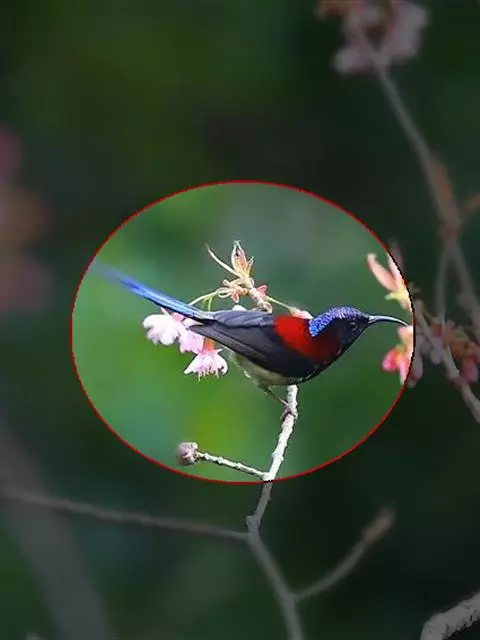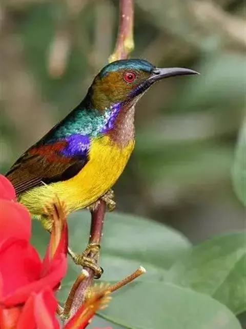 黑胸太阳鸟:小型鸟类,体长9-15厘米。嘴细长而向下曲。雄鸟中央尾羽特长,尾呈楔形,…