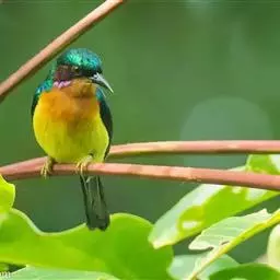 叉尾太阳鸟,雀形目太阳鸟科太阳鸟属留鸟;为小型鸟类,雄鸟头顶辉蓝绿色,上体橄榄绿色,腰明黄色,…