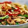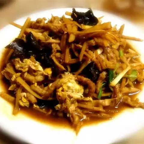 6、起油锅爆香葱姜,滑熟肉丝,盛起备用。