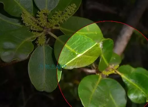 常绿乔木,高2-3米,稀有更高;枝无毛,具多数皮孔。叶互生,厚,近革质,叶片椭圆形或阔椭圆形,少有卵状长圆形,长6-8厘米,宽3-4.2厘米,顶端短尖,尖头钝,基部钝圆或阔楔形,边全缘或有不明显的疏细齿,干时略背卷,两面均无毛,腹面光滑;中脉粗壮,在腹面凹入,背面显著凸起,侧脉约10对,纤细,斜伸,离缘2-5毫米弯拱连接,网脉不明显;叶柄粗壮,长1.5-3厘米,无毛,顶端有2圆形的腺体;托叶卵形,顶端尖,长1.5-2毫米。