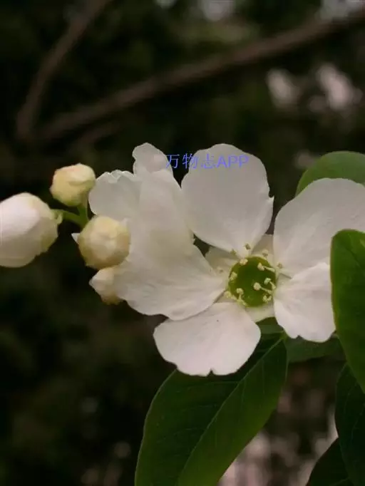 枝条细弱开展;小枝圆柱形,微有稜角,无毛;冬芽三角卵形,平滑无毛,暗紫红色。叶片椭圆形,长椭圆形至长圆倒卵形,先端圆钝或急尖稀有突尖,基部楔形或宽楔形,上下两面均无毛;叶柄短或近于无柄;总状花序无毛;花梗基部较顶部稍长,无毛;苞片小,宽披针形;花直径2.5-3.5厘米;萼筒浅钟状,无毛;花瓣倒卵形,先端钝,基部有短爪,白色;雄蕊15-20,3-4枚一束着生在花盘边缘;蒴果,倒圆锥形,无毛,有5脊,果梗长3-8毫米。花期5月,果期6-8月。