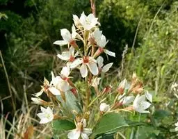 顶生总状花序,有花6-10朵,无毛;苞片小,宽披针形;花直径2.5-3.5厘米;萼筒浅钟状,无毛;萼片宽三角形,长约2毫米,先端急尖或钝,边缘有尖锐细锯齿,无毛,黄绿色;花瓣5,倒卵形,长约1.5厘米,宽约1厘米,先端钝,基部有短爪,白色;雄蕊15-20,3-4枚一束着生在花盘边缘,与花瓣对生;心皮5,花柱分离。